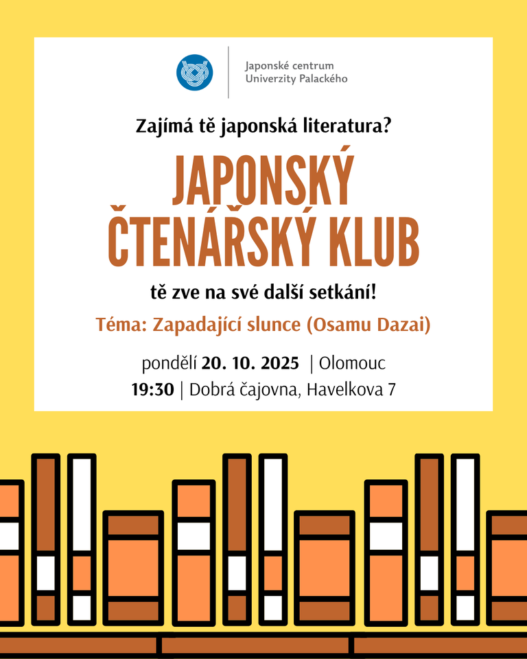 Zajímá vás japonská literatura? Rádi si povídáte o tom, co čtete, a razíte heslo, že tipů na dobré čtení není nikdy dost? Zveme všechny nadšené čtenáře a zájemce o japonskou kulturu, kteří si rádi o tom, co čtou, popovídají, na úvodní setkání našeho Japonského čtenářského klubu v tomto semestru! Dozvíte se, jak setkání probíhají, a také se budete moct seznámit s ostatními starými i novými členy klubu. Těšíme se na vás!